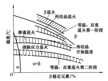 普通退火通常在冶金产品出厂前应用,目的是使钛合金半成品的基本应力消除,并且具有较高的强度和符合技术条件要求的塑性,如图35所示,退火温度一般与再结晶开始温度相当或略低。
