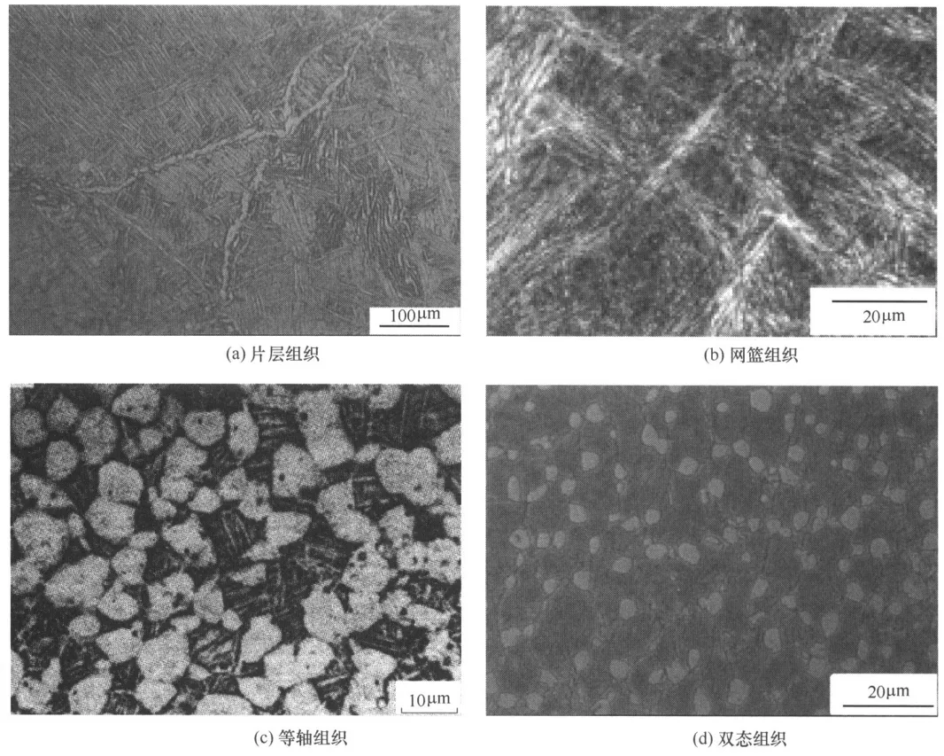 钛合金的基本组织为以α-Ti为基的α固溶体和以β-Ti为基的β固溶体,α合金、近α合金和许多α+β合金的基体为α固溶体,β合金的基体为β相。钛合金的显微组织主要取决于合金成分、变形工艺和热处理过程,典型组织为片层(魏氏)组织、网篮组织、等轴组织、双态组织,如图4所示。