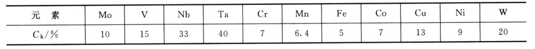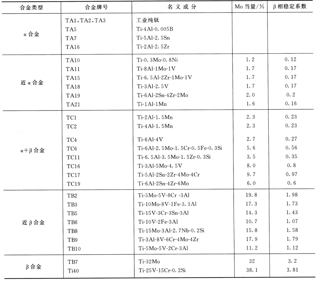 由于钛合金中β相的数量及稳定程度与β稳定元素种类及含量有直接关系,也可按照β相稳定系数对钛合金分类。β相稳定系数是合金中各β稳定元素的浓度与其临界浓度的比值之和,表征钛合金中β相的稳定程度或β稳定元素的作用,表3为常用β稳定元素的临界浓度 Ck。根据浓度计算出相应的β相稳定系数Kp,表4为常用钛合金的Mo当量和β相稳定系数。