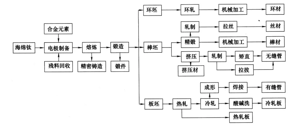 图8为不同类型钛材的生产流程,对海绵钛进行熔炼铸造得到致密的钛锭,再进行不同的压力加工得到不同种类的钛材。环件采用环轧,板材采用热轧和冷轧,无缝管采用挤压一轧制法生产,有缝管采用弯曲成形-焊接法生产。由于变形抗力大和加工温度范围窄,钛合金材料的生产难度大、技术含量高,制约了钛行业的发展。