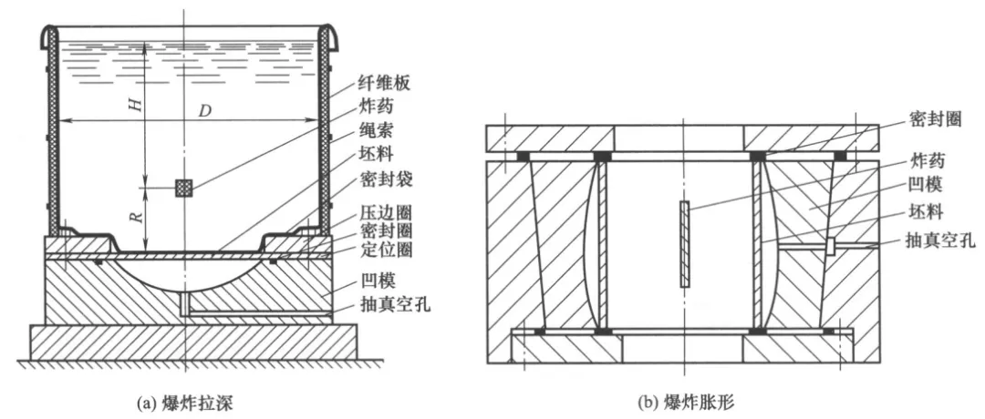 爆炸成形是利用炸药或火药、可燃气体等作为能源,爆炸瞬间释放巨大化学能对金属坯料产生高压冲击波,使其产生塑性变形且以一定速度贴模。爆炸成形主要有爆炸拉深和爆炸胀形等,如图28所示.