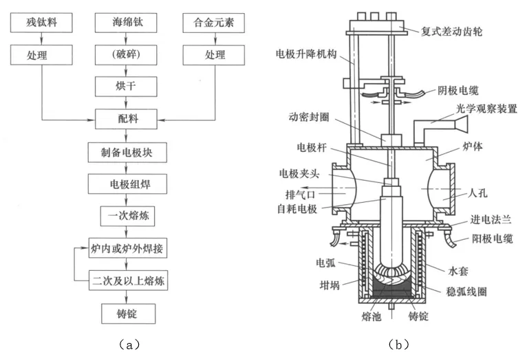图10 a真空自耗电弧熔炼的工艺流程;b真空自耗电弧炉的结构示意图