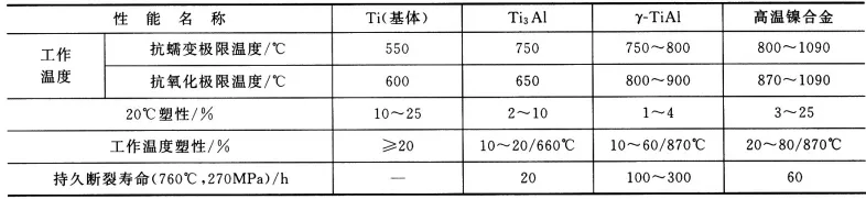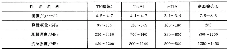 表10 Ti-AI化合物基合金与常规钛合金和镍合金性能对比