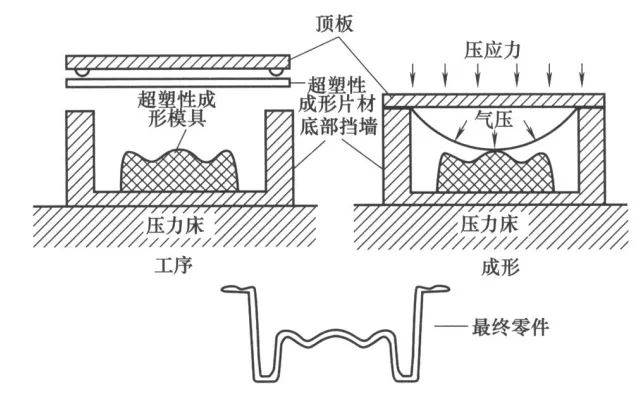 具备细小的等轴晶或α+β双相组织的钛合金,在较高的变形温度和较低的应变速率下,变形抗力大大降低,流动性和填充性大大提高,具有可吹塑和可挤压的柔软性能,采用超塑性成形(SPF)工艺,只需很小的应力就能使难变形合金实现复杂构件的一次成形,可省掉机械加工、铆焊等工序。超塑性等温锻造是将模具加热到金属的超塑性成形温度,以低应变速率进行模锻,经过长时间蠕变,实现薄壁、高筋、形状复杂或难变形钛合金锻件的成形,在航空航天制造领域,特别是发动机的压气机叶片和大型航空复杂锻件生产上展现出较大优势和应用前景。超塑性板料成形包括真空成形、气压成形、模压成形等方法,其中气压成形是航空航天领域应用最广泛的板料超塑性成形方法。图27为钛板料超塑性成形示意图,通常采用氩气保护。