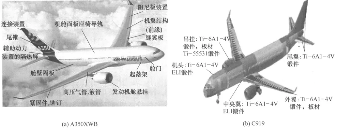 作为飞机机体结构材料,钛合金可用作防火壁、发动机短舱、蒙皮、机架、纵梁、舱盖、龙骨、速动制动闸、紧固件、起落架梁(支撑梁)、前机轮 、拱形架 、隔框盖板 、襟翼滑轨 、腹板等。图40为空客飞机 A350XWB和国产飞机 C919的机体用钛部位示意图,包括起落架、机翼结构、发动机悬架、机翼高压油管和气管、紧固件、舱门、机舱面板或隔板、座椅导轨、尾锥和辅助动力舱的隔热屏等。