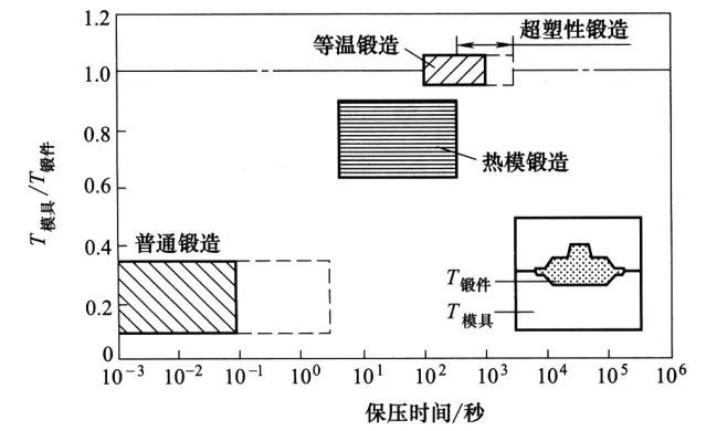 由于钛合金的热导率比铜、铝、铁、镍等金属低,大型坯料加热时断面温度不易均匀,坯料出炉后表面冷却快,出现较大内外温差,容易导致开裂和变形不均匀。为了减少坯料表面的冷却速率,充分预热模具及与坯料接触的工具十分重要,图18为不同锻造方法的模具和锻件的温度状态示意图。热模锻造和等温锻造可生产大型、特大型锻件,可以生产近终形锻件、实现锻件组织和性能的最优化。