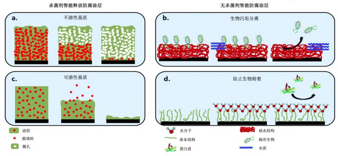 传统的防污涂料是将抗菌剂添加到涂料中,当涂料浸入到海水中发生反应,使抗菌剂在海水中扩散以达到防止海洋生物附着的目的。但抗菌剂却能够污染海洋环境,加剧环境恶化,增加了其他海洋生物的死亡率,对生态环境造成严重破坏。因此,环境友好的防污涂料引起人们的广泛关注。一方面是通过将环境友好型杀菌剂封装到纳米容器中,杀菌剂会在水体中的微环境下从纳米容器中可控释放,发挥其杀菌作用,防止海洋生物在涂层表面生长和附着。另一类涂料通过设计树脂结构,主要由疏水结构构成,使生物污染物随水流流动来摆脱,或者由亲水性结构构成,以防止生物污染物附着在水体内,同时也具有良好的防污性能。